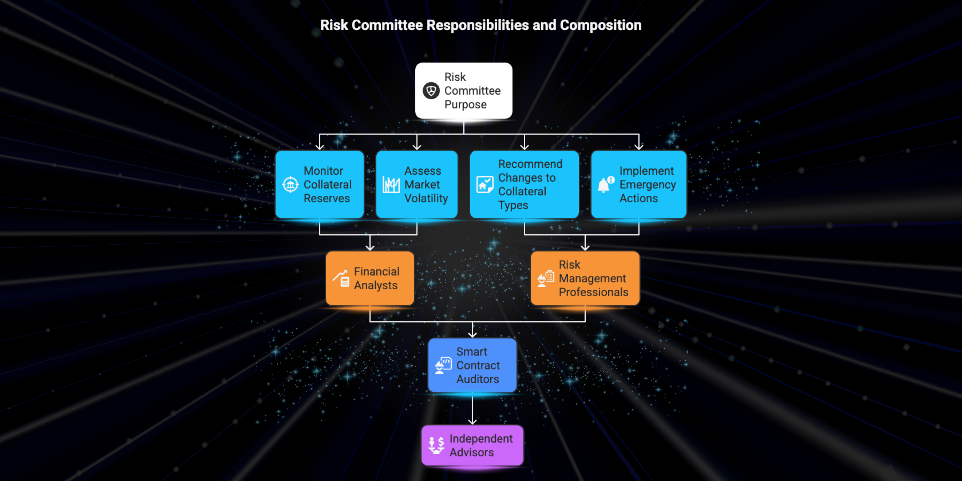 The Risk Committee is primarily responsible for evaluating and mitigating risks within the STBL ecosystem. Its focus is on ensuring financial stability, maintaining adequate collateral levels, and safeguarding against systemic threats.